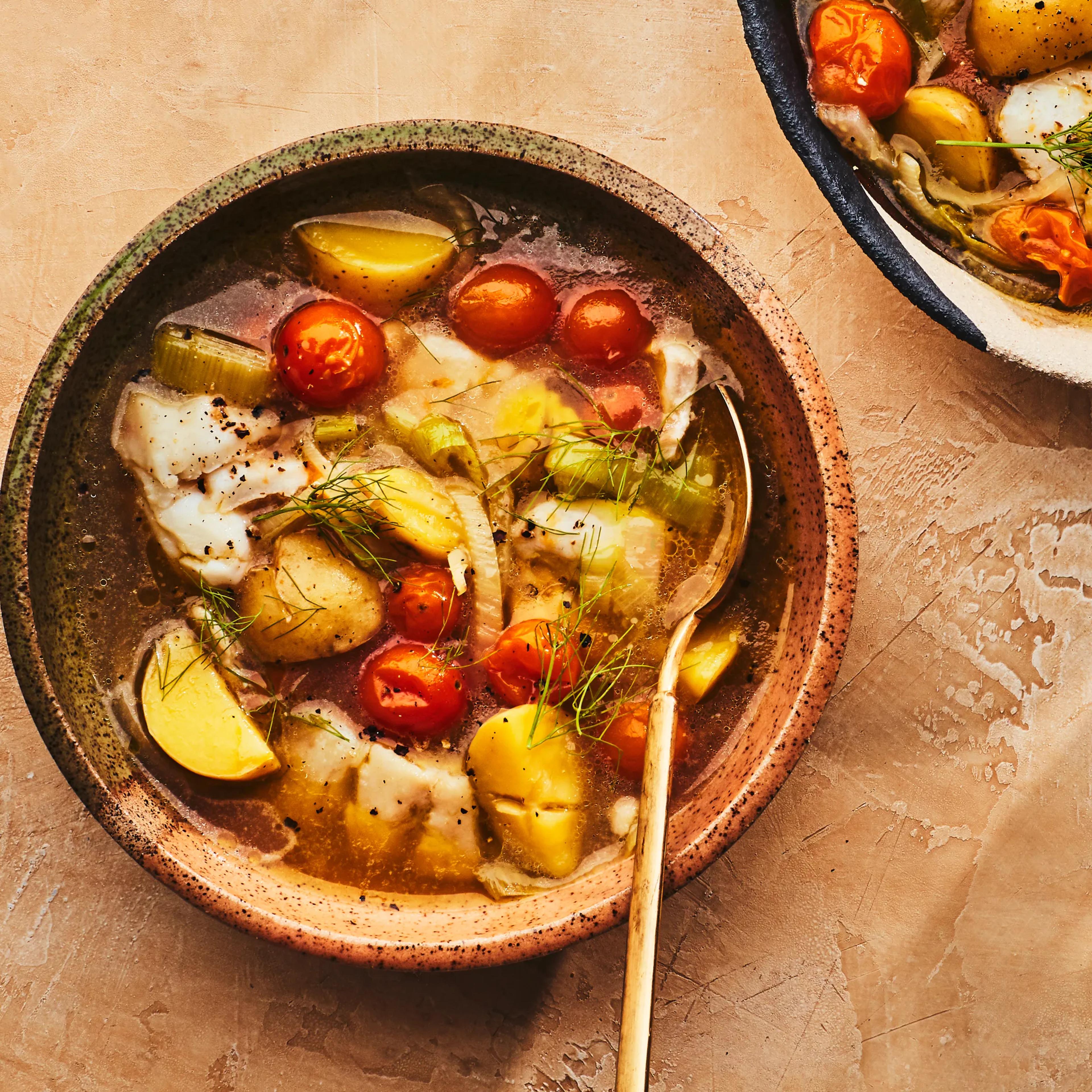 Step 4 Place potatoes in fish stock in a large pot, season with salt, and bring to a boil. Reduce heat to medium, bring to a simmer, and cook, stirring occasionally, until potatoes are almost tender, 10–14 minutes. Add sliced fennel and white leek parts and cook, stirring occasionally, until vegetables are barely tender, 4–6 minutes. Add fish and cook, stirring occasionally, until fish is opaque, about 4 minutes. Remove from heat and stir in tomatoes; taste and adjust seasoning.