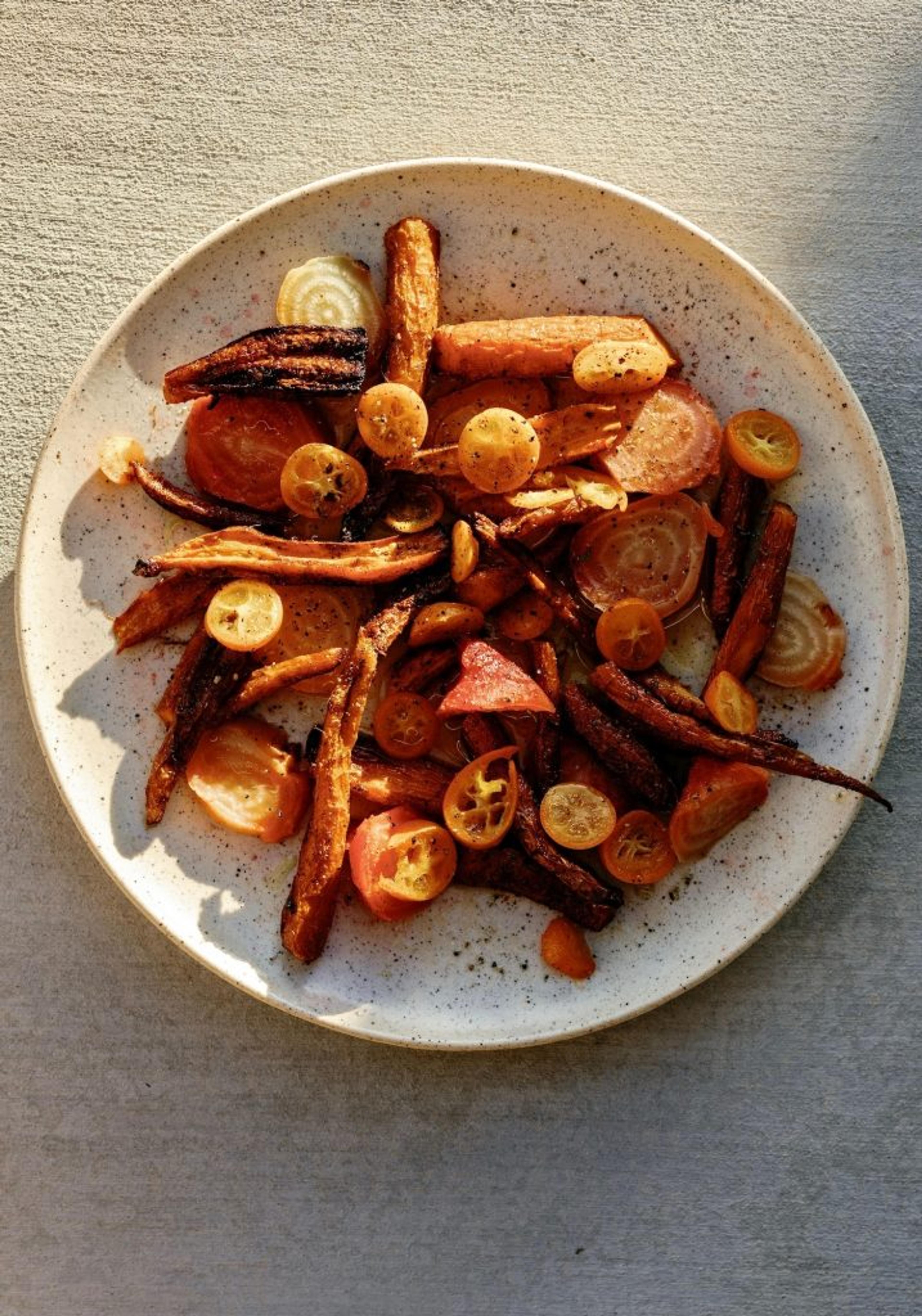 A beautiful plate to serve, the bright acidity of the kumquats works great with the sweet roasted carrots and beets. Recipe developed for Camille Styles, image by Michelle Nash.