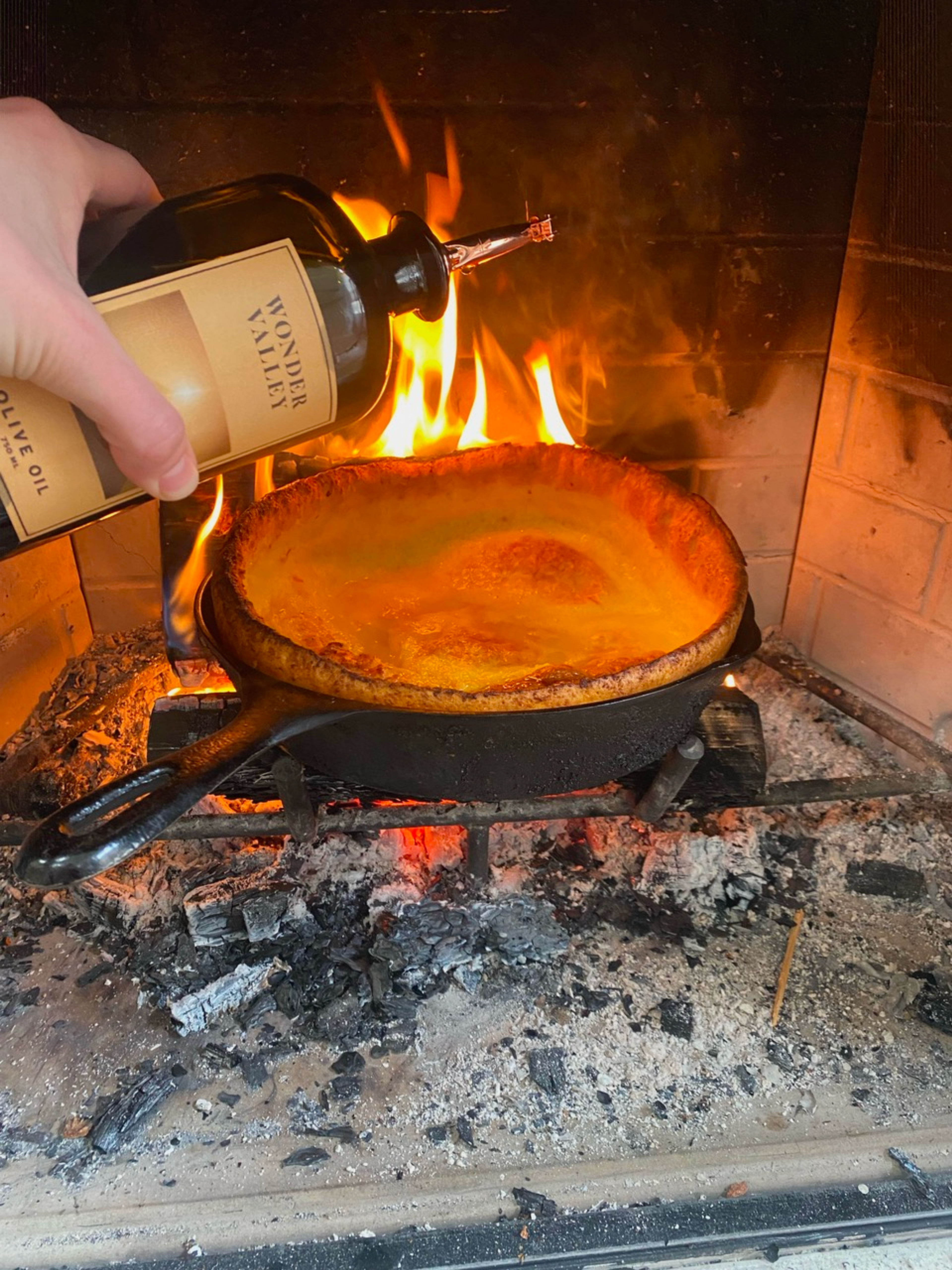 "Dutch baby pancakes are one of my favorite things to make on a Sunday morning. So easy and scrumptious and you can whip one up in no time. I make mine with saffron milk and Wonder Valley olive oil resulting in the most beautiful sunrise-like creation rising in your cast iron pan. Sometimes, like today I pop it in the fireplace so the edges get extra crispy and golden."