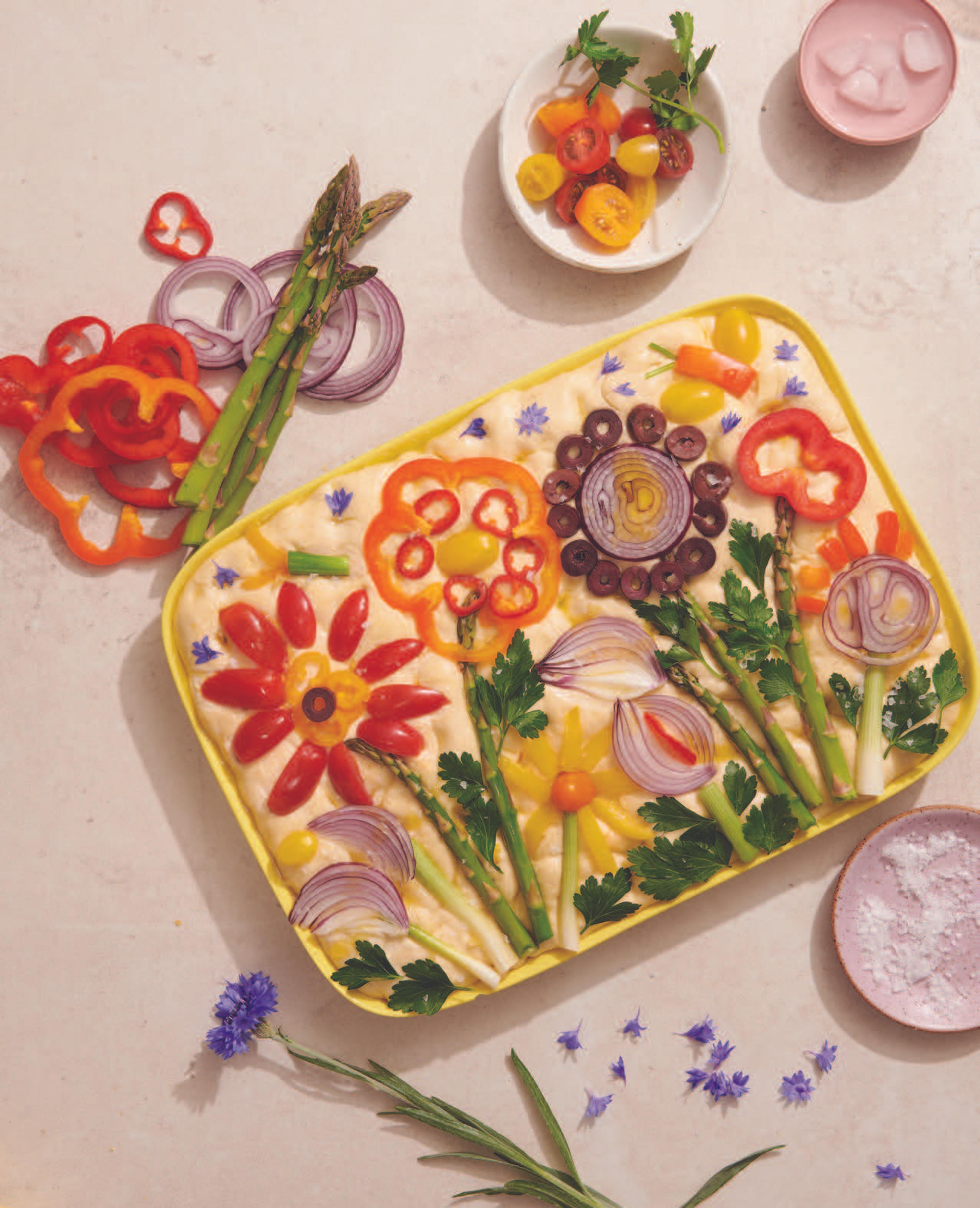 - Now it’s time to decorate your blank focaccia canvas, imagining your favorite garden. Remember that, while baking, the dough grows and the veggies shrink, so for the brightest and best results, cover the dough completely with various vegetable flowers. Sprinkle with the flaky salt.