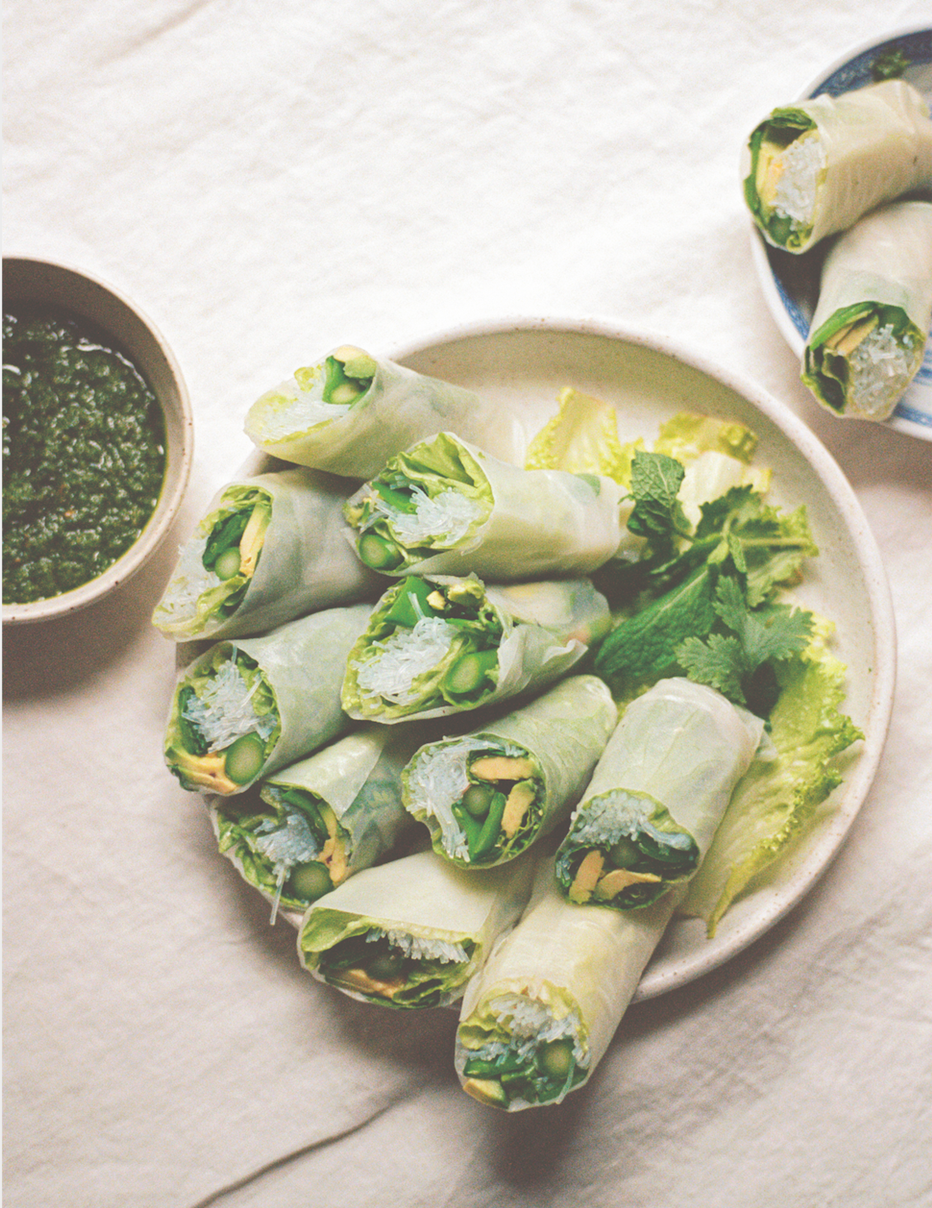 If spring had a flavor, it would be these brightly herbaceous "spring" rolls. The asparagus, snow peas, lettuce and abundant herbs provide a fresh, crisp mouthful, perfect for a gathering or a fun roll-it-yourself midweek dinner for the family. We're thrilled to share this recipes from one of our favorite cookbook authors, Hetty McKinnon.
