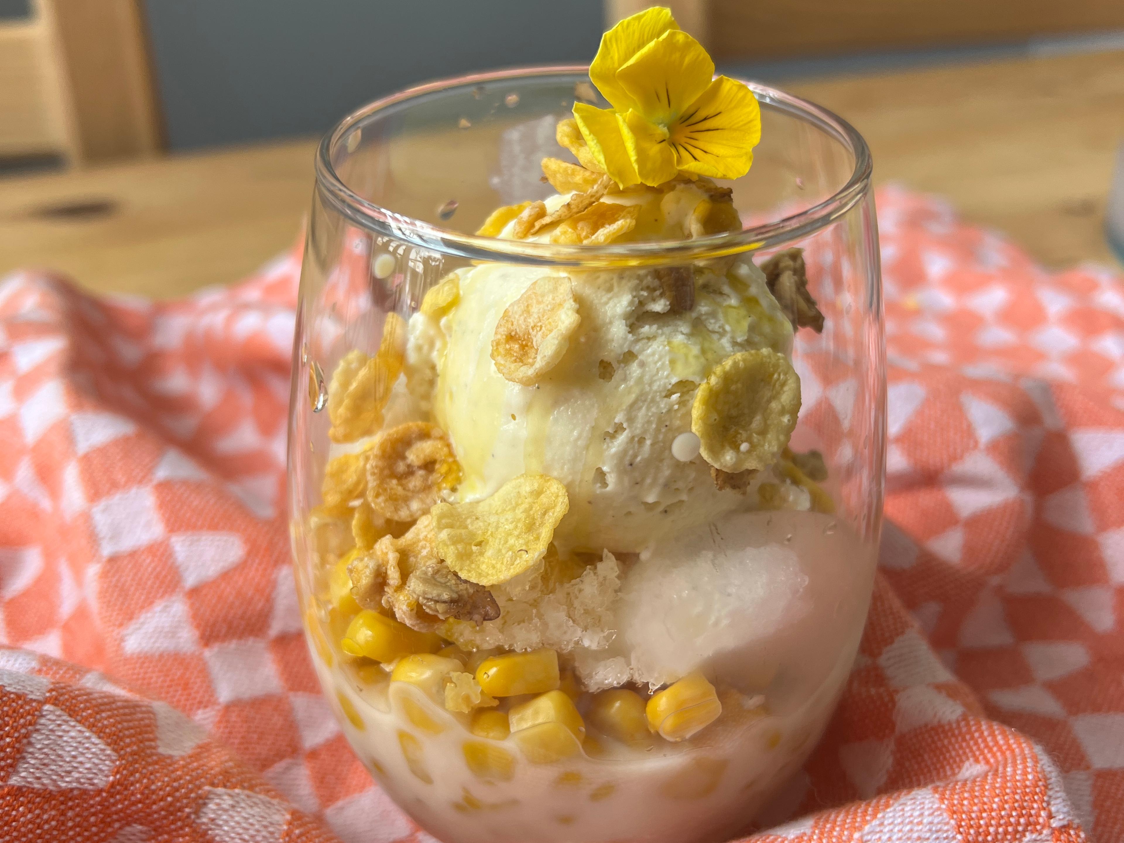 - Drizzle the surface with about 1 tablespoon of olive oil, sprinkle with 1 tablespoon worth of cornflake cereal and a pinch of flaky sea salt. Garnish with an edible flower. Repeat the layering process for 2 more glasses worth of mais con yelo.