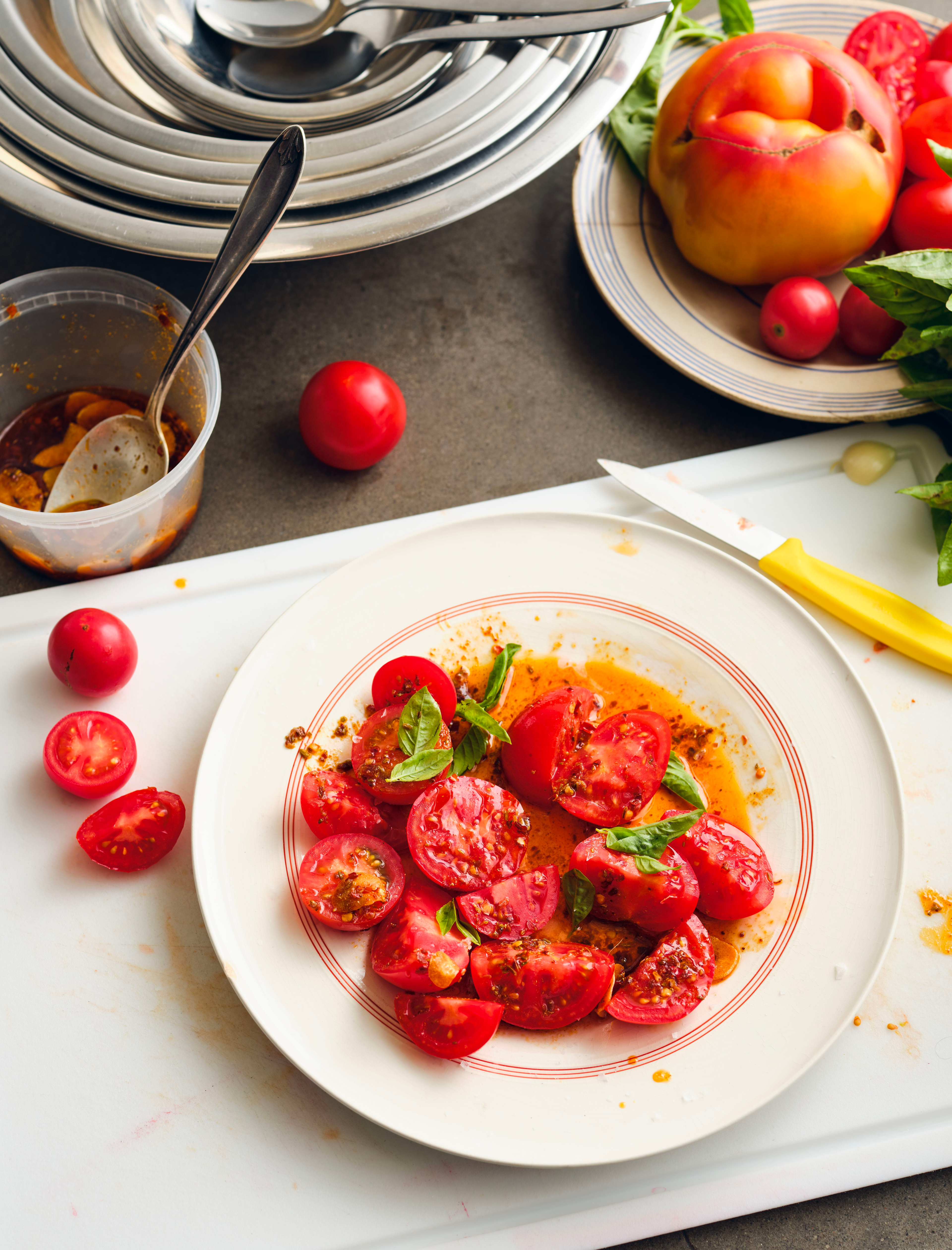 Celebrate summer with this simply delicious recipe where tomato is the star by Andy Baraghani. Here's what Andy has to say about the recipe: "The truth is, most tomato salads don’t need a recipe. Vinegar, olive oil, plenty of crunchy salt, and call it a day. If you have some herbs on hand, throw those in. What would a tomato salad look like if it deserved a recipe? Something like this. Very savory. Topped with garlic-chile crisp and dressed with its delicious oil. Anchovies and fennel seeds heighten the tomato’s flavor while bringing even more savory undertones. It’s spicy, with the chile flakes. This isn’t a simple caprese that you whipped up on a summer afternoon. It’s still simple but steals the show."
