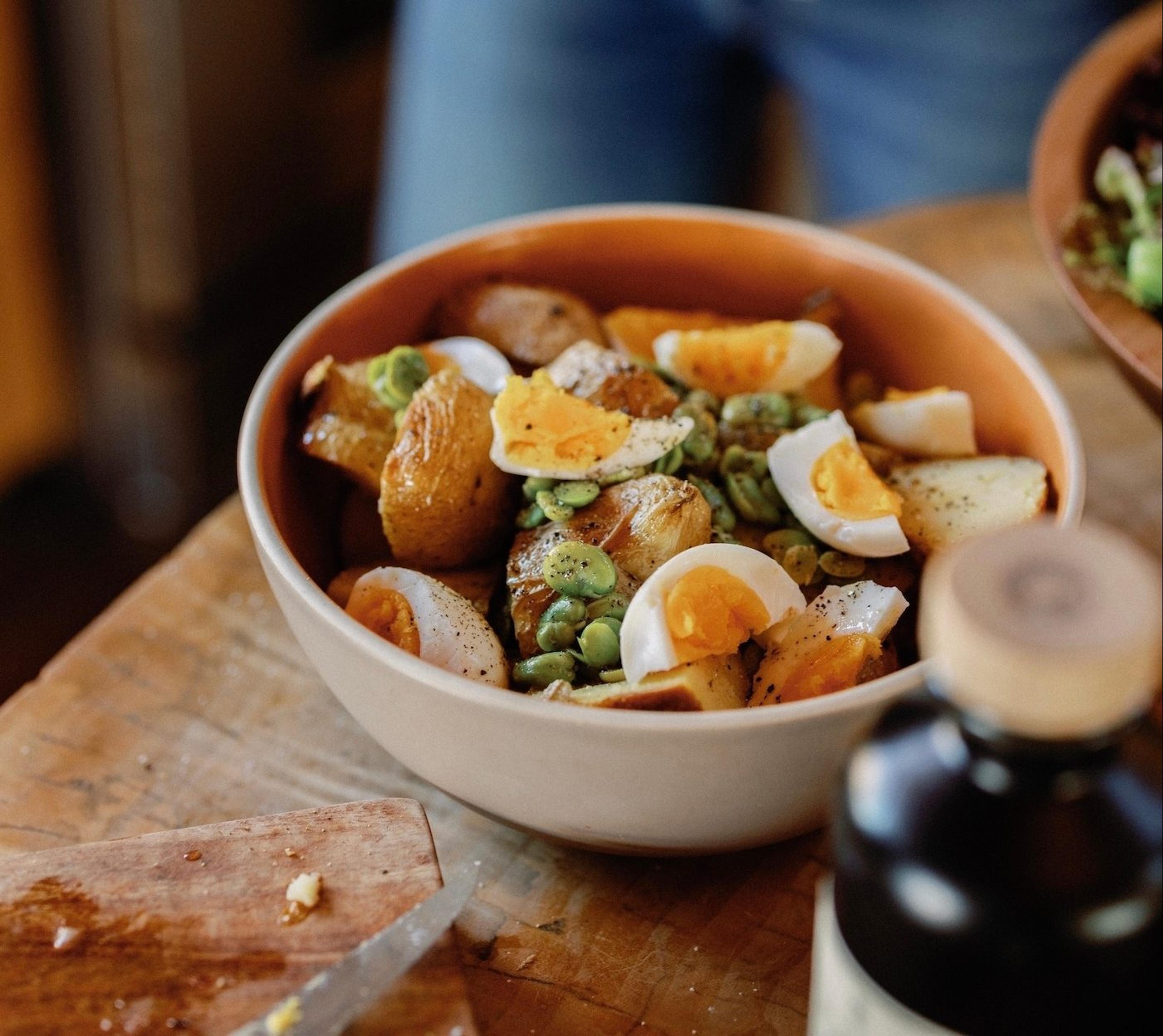 - Soft boil the remaining 3 eggs by bringing a small pot of water to a rapid boil and lowering in the eggs and cooking for 8 minutes for a slightly jammy yolk. Cool in an ice bath, peel and cut into quarters.