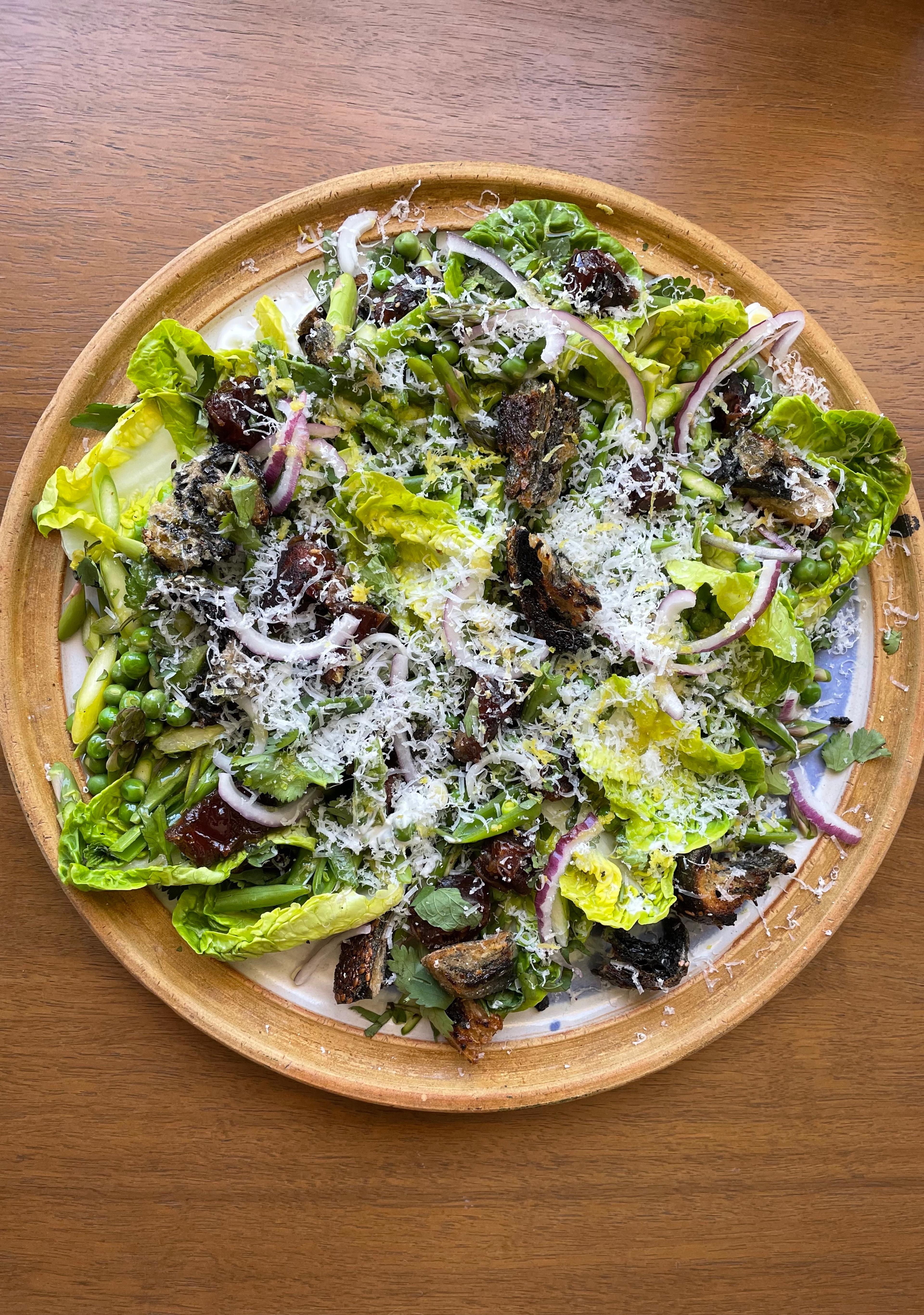 6. Grab your favorite salad plate and start assembling your salad. Using a tablespoon or spatula spread an even layer of crème fraiche on the bottom of your plate. Add your little gems followed by sugar snaps, asparagus, sourdough croutons and peas. Top with charred dates, mint, cilantro, shallot and pecorino. Using a spoon, drizzle dressing evenly over your salad. Season with maldon salt and freshly ground pepper.